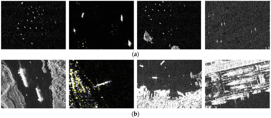 Examples of SAR images from the SSDD dataset. (a) Large proportions of small ships. (b) Multi-scale ships with complex background.