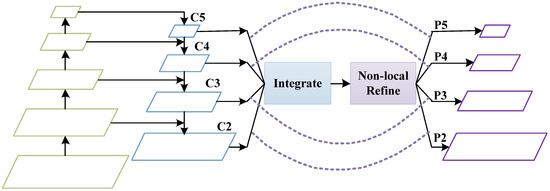 With the increase of convolutional step size and residual network hierarchy, the spatial resolution of feature maps decreases gradually, while the number of channels increases gradually. The low-level features contain accurate location information, but lack semantic information, which is suitable for small-scale ship detection. In contrast, the high-level feature contains abundant semantic information but poor location information, indicating that it is suitable for detecting large ships. Therefore, FPN uses the information of different layers in a CNN network to obtain the features of the final combination. As presented in Figure 3, the structure of FPN can be divided into bottom-up path, top-down path, and horizontal connection. In addition, several typical FPN and its extended versions were designed to take advantage of multi-scale features, and they augment the features of the pyramid with bottom-up or top-down information paths. Unlike other FPNs that directly add and fuse features of different resolutions, BiFPN [46] improves detection accuracy and efficiency by repeatedly utilizing each feature network layer composed of top-down and bottom-up paths. However, they pay more attention to the features of adjacent resolutions than to other resolutions in the integration process, and the semantic information of adjacent layers will be diluted. Therefore, Pang et al. proposed the balanced feature pyramid network (BFPN) to efficiently utilize multi-scale features, as shown in Figure 4.