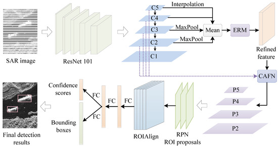 For the complex background and the unsharp features of small objects in SAR ship detection, it is of vital importance that the detection network can enhance or suppress different channels for different tasks. However, BFPN only considers the relationship between features from the spatial dimension, and ignores the difference in each feature channel. Therefore, to overcome this issue, we develop the enhanced refinement module (ERM) to improve feature representation capabilities and make BFPN more discriminating. In addition, BFPN fuses semantic features and original features through simple superposition, resulting in serious aliasing effects and performance degradation of SAR ship detection. To mitigate the negative effects of aliasing, a straightforward solution is to exploit an attention module on a feature pyramid. We expect that attention mechanisms at different layers can learn from information at other layers. Therefore, we propose a channel attention-guided fusion network (CAFN) inspired by CBAM [40], which guides each layer of the pyramid to mitigate aliasing effects. The proposed A-BFPN contains four main components. The backbone uses the ResNet-101, the neck includes enhanced refinement module (ERM) and channel attention-guided fusion network (CAFN), the region proposal network (RPN) and the head include classification and regression of bounding boxes, illustrated in Figure 5. Details of the algorithm are described in the following.