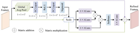 where represents the balanced feature with dimensions obtained in Equation (1), represents a global average pooling function that transforms the dimension to , represents a fully connected layer that reduces channel dimension to , the tensor passes through the function, and then the output tensor with channel size restored to is obtained through another fully connected layer . As a result, we obtain the excitation value of the channel passes through the sigmoid function of the balanced feature . Finally, the excitation tensor is broadcast and multiplied by the balanced feature to adjust its channel: