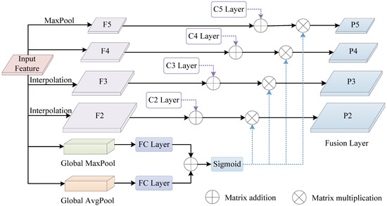 where the feature with resolution level is represented as . The number of multi-level features is represented as , and the lowest and highest-grade indexes involved are represented as and , respectively.