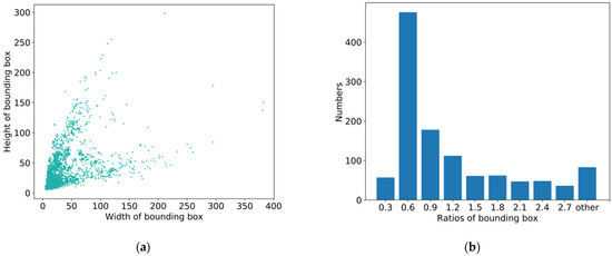 The ship target images in SSDD have multiple polarization modes, multiple resolutions, and rich scenes. The SSDD data were mainly obtained from TerraSAR-X, Sentinel-1, and Radarsat-2 sensors, including VH, HV, VV, and HH polarization modes. In addition, the resolution of SAR images ranges from 1 m to 15 m. The detailed summary of the data information is described in Table 1. SSDD dataset contains 1160 SAR images of 2358 ships, each containing an average of 2.12 ship targets. Figure 8a,b respectively represent the distribution of the height-width and height-width ratio distribution of each ship object.