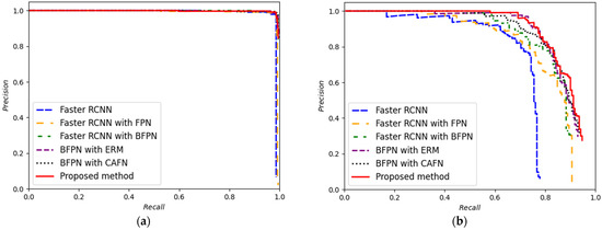 Figure 9 depicts the comparison results of P-R curves of different methods, where Figure 9a,b respectively represents the results of offshore and inshore tests. In Figure 9a, the P-R curves of these methods show little difference, indicating satisfactory performance in offshore ship detection. In Figure 9b, when the background becomes complex, there are obvious differences between these methods. ERM and CAFN are used to achieve the best detection performance, because we take full advantage of multi-scale features and reduce the aliasing effect of fusion investment. This reflects the validity of the proposed method.