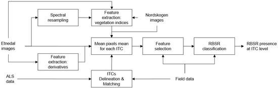 Numerous studies have examined using UAV-based sensors to monitor forest pathogens and other health issues. Otsu et al. detected pine processionary moth defoliation in Spain using a combination of Landsat 8 and multi-spectral UAV imagery [14]. Zhang et al. predicted the extent of defoliation on Pinus tabulaeformis Carrière due to the Chinese pine caterpillar using data from a UAV-based hyperspectral camera [15]. Lin et al. used hyperspectral imagery and ALS data to predict damage from pine shoot beetle in Yunnan pine [16]. Their study found that hyperspectral imagery-based estimates of chlorophyll levels and ALS intensity metrics were the most significant predictors of pine shoot beetle infestation. Näsi et al. used a hyperspectral camera with a spectral range of 500–900 nm to classify Norway spruce trees based on bark beetle infection status (healthy, infested, dead) with an overall accuracy of 76% [17]. Subsequent work showed that UAV imagery delivered greater classification accuracies than satellite imagery, likely due to the finer spatial resolution of the UAV imagery [18]. Honkavaara et al. used multitemporal hyperspectral and multi-spectral imagery to attempt to detect RBSR and European spruce beetle attacks at a site in Finland. Their work focused specifically on detecting beetle infestation before any visible changes in foliage color had occurred, rather than beetle infestation with visible foliar symptoms. The overall accuracy obtained in their study was around 45%, although their study used a relatively small sample size, which could have limited the accuracy of their models. While RBSR-infected trees were included in their classification, detecting RBSR was not their study’s primary goal [19].