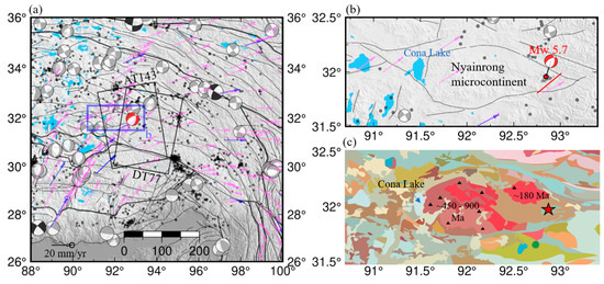 (a) Regional seismotectonic context around the 2021 Nagqu Mw 5.7 earthquake. Red focal mechanism is the hypocenter of the 2021 Nagqu event. Gray focal mechanisms are historical events with Mw > 5.5 from Global Centroid Moment Tensor (GCMT) [7]. Black focal mechanisms are Mw > 7 historical earthquakes. Black dots are historical earthquakes with Mw between 4 and 5.5. Purple and black vectors are, respectively, continuous and campaign Global Navigation Satellite System (GNSS) velocities from 1998 to 2014 [8]. Blue polygons are lakes with area larger than 1 km2 from National Tibetan Plateau Data Center [9]. Black rectangles represent the spatial coverages of Sentinel-1 SAR data from one ascending track 143 (AT143) and one descending track 77 (DT77). Blue rectangle bounds the extent of enlarged (b). (b) The zoom-in of blue box in (a). (c) Geological map covering a similar region of (b) modified from the 1:1.5 million geological maps of the Tibetan Plateau and detailed lithology properties are available [10]. The lithology age marked in (c) is adopted from Xie et al. (2014) [2].