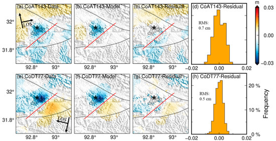 Observed and modeled coseismic ground displacement in satellite line of sight (LOS) in both (a–d) AT143 and (e–h) DT77 tracks. Positive values indicate relative motion of the ground surface toward the satellite (LOS range decrease). First column: the observed surface displacement fields; Second column: model predictions; Third and fourth columns: residuals between observations and models and the histograms of residuals. Black contour with a 0.1 m interval is the coseismic slip model. Red line and black star represent the surface trace of the modeled seismogenic fault and the epicenter estimated in this study based on InSAR data, respectively.