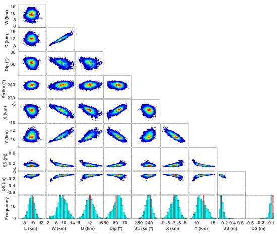 After 5 × 106 iterations, we obtained well-converged Markov chains, indicating it did explore the parameter space sufficiently. The maximum-a-posteriori probability uniform slip model solution reveals the optimal fault plane of 9.8 km long and 9.3 km wide with a strike angle of 240.4° and a dip angle of 59.2° (Table 3). Trade-offs between the fault parameters are somewhat inconspicuous (i.e., strike and dip angles), as indicated by the histograms of posterior probability distributions (Figure 4). These parameters of fault geometry are consistent with previous studies that used either geodetic or seismological data (Table 1).