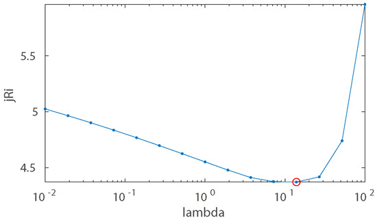 The jRi curves for coseismic slip inversion. Red cycle on jRi curves is the corresponding jRi and lambda values used to weight the smoothing of coseismic slip inversion.
