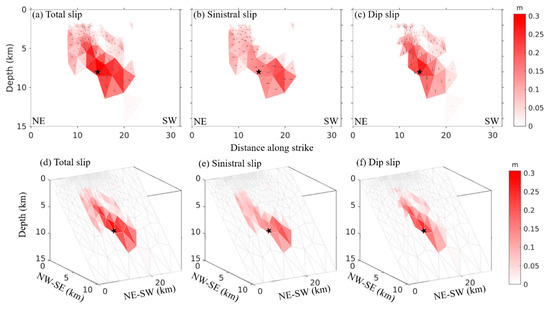 Distributed coseismic slip. (a) Total coseismic slip; (b) sinistral slip component; and (c) dip-slip component. Black stars represent the hypocenter of the 2021 Mw 5.7 Nagqu earthquake estimated in this study based on InSAR data. Black arrows indicate the slip vector. (d–f) are 3D views of (a–c), respectively.