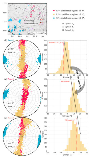 We estimated the local stress fields by the focal mechanisms during 1990−2019 from a previous study [11]. We focused on three event clusters (M 4.3), namely Zone 1–3, surrounding the Nyainrong microcontinent (Figure 7). Zone 1 is adjacent to the southwest region of the Nyainrong microcontinent, while Zone 2 and Zone 3 are adjacent to the northeastern region of the Nyainrong microcontinent (Figure 7). In total, 22 focal solutions were classified as six, eight, and eight records in Zone 1, Zone 2 and Zone 3, respectively (Table 4). We utilized an iterative joint inversion method [30] to calculate principal stresses , and the stress ratio representing the relative magnitudes of the principal stresses [31]. With the bootstrap resampling approach [32], this method allows for determining the 95% confidence intervals of an optimal stress tensor. To obtain the optimal stress parameters (Table 4), we estimated 2000 bootstrap samples with random noise of 10°. The average misfit angle α is the difference between the observed and predicted fault slip directions, which can be used to reflect the degree of stress heterogeneity and evaluate the performance of stress inversion.