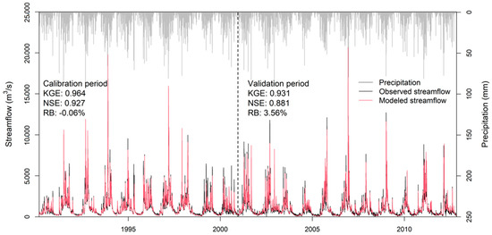 In this study, the GR4J model is calibrated and validated using the basin-averaged precipitation observations and the observed streamflow data at the Hengshi station utilizing the Shuffled Complex Evolution-University of Arizona (SCE-UA) optimization algorithm [43]. The KGE between the observed and modeled streamflow is used as the objective function to be maximized. The year 1990 is taken as the “warm-up” period; the period 1991 to 2000 is used as the calibration period, i.e., the objective function is calculated using the modeled data in this period. 2001 to 2011 is used as the validation period.