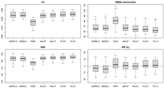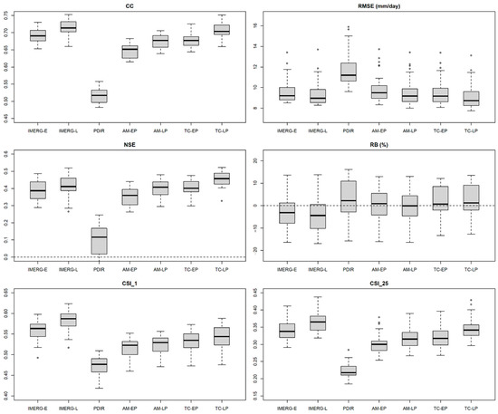 Figure 3 shows the boxplots of the assessment metrics of the SPEs for the meteorological stations; it is observed that TC-EP and TC-LP have the best performances among all original and merged SPEs, except for the CSI. The PDIR exhibits the lowest accuracy of the SPEs and the widest range of the RMSE, NSE, and RB values, revealing relatively high instability over different spatial locations. In comparison, the TC-EP and TC-LP generally have a narrower range of the NSE than the other SPEs, indicating the relatively high stability of the performance of the TC-based merging approach.