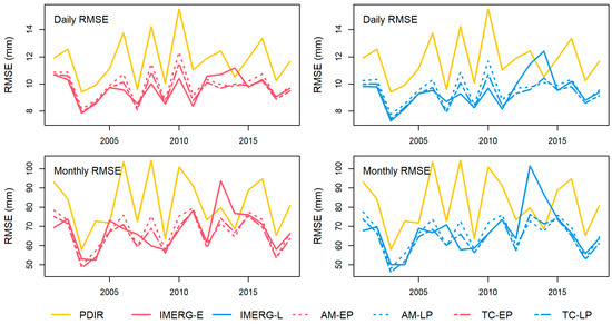 RMSEs of the SPEs at daily and monthly scales for each year from 2001 to 2018.