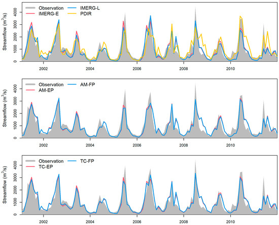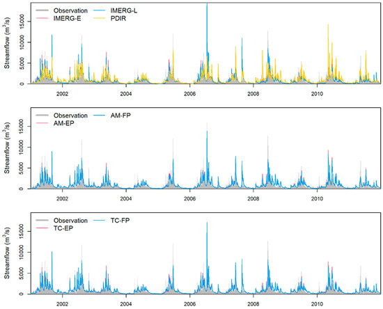 Figure 7 shows that the streamflow modeled by the TC-based merged SPEs is highly consistent with the hydrograph results at the monthly scale. In addition, the PDIR and the IMERG products have different performances for matching the hydrograph results in different periods. The PDIR generally captures smaller flows, while the IMERG products capture the mid and high flows more accurately. As the merged products of the PDIR and IMERG products, the TC-EP and TC-LP reasonably balance their advantages for low and high flow modeling, generating more reliable streamflow modeling results.
