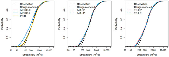 Figure 8 shows the exceedance probability curves of the streamflow modeled by the SPEs. The data are obtained from the sorted daily streamflow records and their corresponding quantiles, showing the discrepancies of the modeled streamflow at different quantiles, thereby revealing the systematic bias of SPEs for different magnitudes of streamflow. The results show that, for the original SPEs, both IMERG products generally underestimate low streamflow below 500 m³/s. Whereas, the PDIR generally exhibits smaller discrepancies with the in-situ observations for the low streamflow below 500 m³/s, indicating the smaller systematic bias in low streamflow modeling. Nevertheless, such a local superiority of PDIR has limited influence on the overall poorer accuracy of PDIR in general. The curves of the AM-based and TC-based SPEs, which integrate the PDIR data, are much closer to the in-situ observations than the original IMERG products, thus also indicating the better performance in systematic bias in low streamflow modeling.