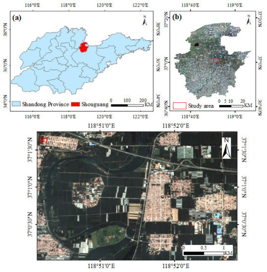 Map of the study area: (a) Municipal administrative boundary of Shandong Province; (b) Sentinel-2 RGB composite image of study area of Shouguang City; (c) Planet RGB composite image of the study area.