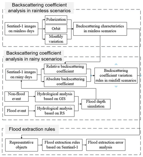 This paper aims to study monthly variations and the influence of polarization and orbit on backscattering coefficients using multi-temporal Sentinel-1 images in Kouzi Village, Shouguang City, Shandong Province, China. Sentinel-1 data in different rainfall events are used to study variations in the backscattering coefficient according to flood depths. The flood depth simulation with hydrological analyses based on GIS and RS technology is used to reveal the change rules of the backscattering coefficient with flood degrees. Finally, backscattering coefficient differences caused by monthly variations and satellite system parameters are compared to those caused by floods to analyze the quantitative flood extraction errors caused by these factors.