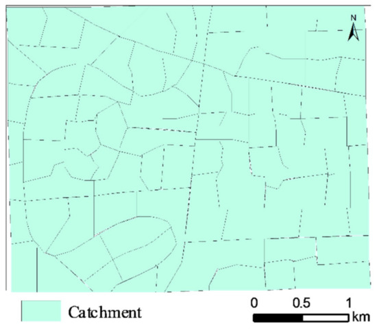 Because the study area is rural, with flat terrain and without pipelines, a three-level catchment division method using hydrologic and geometric methods was proposed to divide catchments. First, a large-scale watershed division of the study area was carried out using river channels and main roads, because river channels are subsidence areas and usually function as watershed outlets. The main road is a highway. Its elevation is higher than the grids on both sides, and the river and the main road naturally cut off the catchment. Second, for each first-level watershed, DEM data and the D8 algorithm are used to divide the catchment area into smaller parcels. However, due to the flat terrain in the area, the accumulation of confluence resulting from the use of the D8 algorithm is small, and the water flow path is short, so the catchment area is small. Usually, in the process of surface confluence, roads will generate water flow paths and the properties of the runoff between different types of land are different greatly, which limits its circulation. Therefore, the catchment areas were merged and sorted according to the secondary roads and land types. The catchment area of the study area was divided based on the three-level catchment area division method. A total of 88 catchment areas were obtained (Figure 4), and the average area was 13.33 ha.