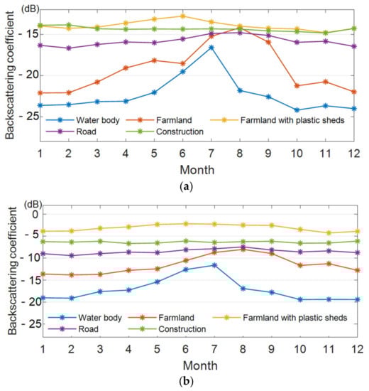 Line chart of monthly backscattering coefficient in 2019: (a) Backscattering coefficients with integrated orbit and VH polarization; (b) Backscattering coefficients with integrated orbit and VV polarization.