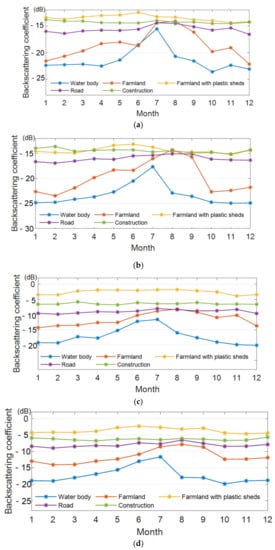 Monthly backscattering coefficients with different polarizations and orbits: (a) VH and ascending orbit; (b) VH and descending orbit; (c) VV and ascending orbit; (d) VV and descending orbit.
