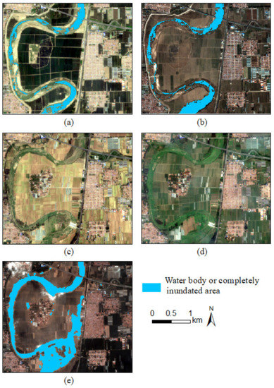 In this study, Sentinel-1 images and a threshold method are used to extract the completely inundated area. The modified soil adjusted vegetation index (MSAVI) difference, with an empirical threshold in [46], and the change detection and threshold method (CDAT) in [47], were used to assess the partly inundated area. MSAVI difference with an empirical threshold is first used to calculate the MSAVI differences between pre-flood and flooding periods, and then to extract the inundated area based on the MSAVI difference result and an empirical threshold. MSAVI can be calculated via Equation (7):