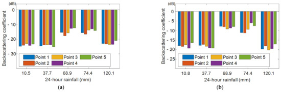 Figure 11 shows the change process for each object’s backscattering coefficient in different rainy scenarios. The results are as follows: (1) For dry or shallow rivers, the backscattering coefficients with two polarizations become smaller than the normal scattering coefficient in each rainfall scenario. (2) For the farmland, the backscattering coefficients become smaller when the soil moisture increases, but no surface runoff occurs. When the soil moisture is saturated and the flood depth does not exceed 10 cm, the backscattering coefficients for farmland are increased. The backscattering coefficients increase when the flood depths at the sample points are about 10–30 cm. When the flood depths of the sample points are greater than 30 cm, the backscattering coefficients of completely inundated sample points become smaller, while the coefficients of the incompletely inundated points increase. (3) For the farmland with plastic sheds, the flood depths are less than 15 cm due to the two rainstorms, but the change trends of the coefficients are inconsistent. During the flood, sample points from 42 to 44 are completely inundated and the flood depths are greater than 30 cm. As such, the backscattering coefficients of the sample points become smaller. The flood depth of sample point 41 is less than 20 cm, and the backscattering coefficient of this point becomes larger with VH polarization and smaller with VV polarization. Additionally, the change of backscattering coefficient amplitude is smaller than that of the sample point with a flood depth greater than 30 cm. (4) For the road, the backscattering coefficients with the two polarizations are increased with the increasing inundation. (5) During the continuous increase of flood depth in the construction site, the backscattering coefficients with the two polarizations are increased slightly. (6) A comprehensive analysis of the variation of the other four classifications, except for water, show that the variation with VH polarization is greater than that with VV polarization, and the variation of the backscattering coefficients of farmland is the largest, and the trends of construction sire and road are the same, demonstrating only relatively small changes.