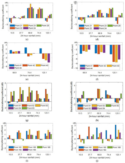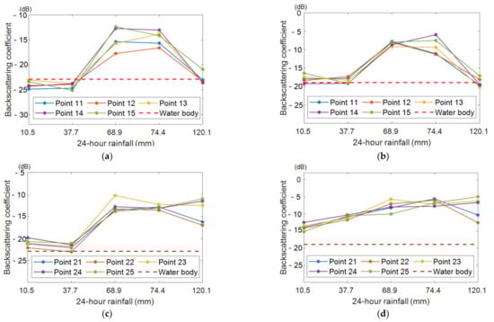 The sample points are those with obvious inundation during rainfall, based on the flood depth simulation results. Such points are usually local depressions, and flood depth continues to increase with increased rainfall. Figure 10 shows the distribution of the sample points. The IDs of water body sample points are from 11 to 15 in Mi River. In the rainfall event on 20 August 2018, the Mihe River was full and was considered an open water body. Therefore, the mean value of the backscattering coefficients of all the water sample points on this day is taken as the backscattering coefficient of an open water body, which provides a reference for studying variations in the backscattering coefficients of ground objects in different rainfall scenarios. The IDs range from 21 to 25 for farmland sample points, and points 21 and 22 were completely inundated during the last rainfall. The IDs range from 41 to 44 for farmland with plastic sheds sample points, the IDs range from 81 to 85 for road sample points, and the IDs range from 161 to 165 for construction sample points. Because of the frequent changes in farmland with plastic sheds, all areas underwent change and were flooded in the five rainfalls. As such, the experimental data of the farmland with plastic sheds were only from the three rainfall events in 2018.