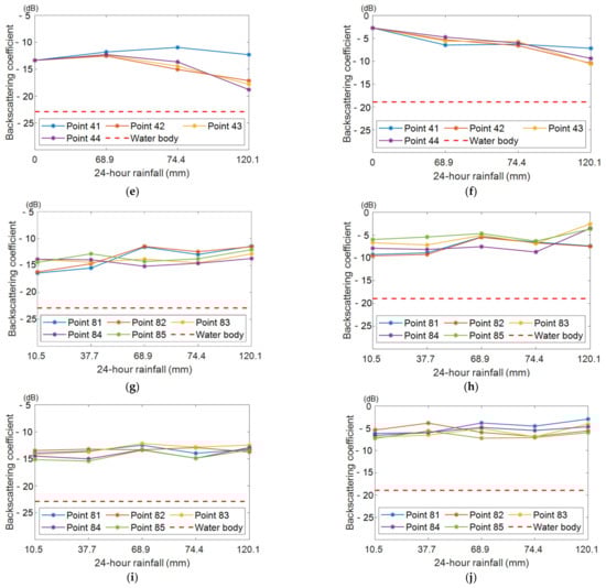 Absolute backscattering coefficient with rainfall: (a) Water body—VH; (b) Water body—VV; (c) Farmland—VH; (d) Farmland—VV; (e) Farmland with plastic sheds—VH; (f) Farmland with plastic sheds—VV; (g) Road—VH; (h) Road—VV; (i) Construction—VH; (j) Construction—VV. The red dotted line indicates the backscattering coefficient of an open water body instead of the water body sample areas.