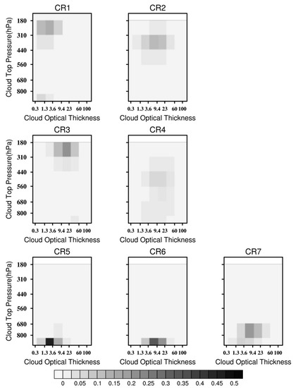 We classify the clouds into seven regimes using the k-means clustering algorithm [41]. The algorithm is objective except for the setting of the number of clusters, k. We started at four clusters. The initial cluster centroids are selected from the CTP-COT histograms of some random grids on 1 May 2002. The Euclidean distances between the daily COT-CTP histogram of each grid and the cluster centroids are calculated and each grid is assigned to the nearest cluster. Once the cluster is allocated, a new centroid is recalculated by averaging all the histograms within the cluster. The process of acquiring new centroids repeats until all data are examined. Ten iterations are performed to ensure the resultant centroids are converged.