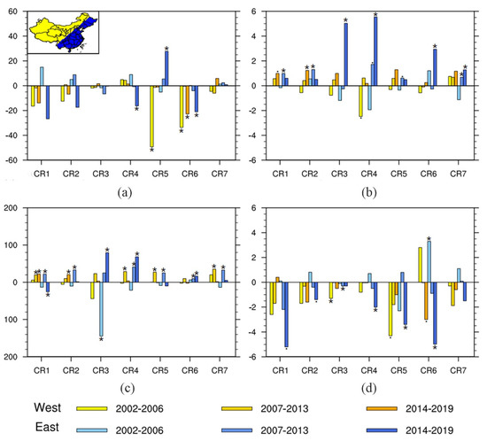 Due to the obvious east–west differences in the AOD trends, we used the “Heihe–Tengchong Line” as the divide to examine the trends of cloud properties in eastern and western China (Figure 4). Most CTP shows a negative trend during 2002−2019 in both eastern and western China, i.e., clouds were higher (Figure 4a). The trend of higher clouds in the west was more obvious than in the east. The CTP of CR5 (stratocumulus) in the west declined by 51.68 hPa per 18 years. The variations in COT and LWP are in good consistency (Figure 4b,c). This may be related to the fact that MODIS obtained LWP data by the inversion of COT [50]. The COT and LWP increased significantly after 2007, indicating that clouds became thicker and cloud liquid water content became more abundant. For CR4 in the eastern region, the COT increased by 5.32 hPa per 18 years, and the LWP increased by 88.16 g/m2 per 18 years. Figure 4d shows a general decreasing trend of TCC in recent years, which is consistent with previous studies that a fluctuating decreasing trend of TCC were found over China in the last fifty years [51,52]. The decrease in TCC in eastern China coincided with the decrease in aerosol content from 2007 to 2019. Generally, CTPs decrease (i.e., higher clouds), COT and LWP increase (thicker cloud), and TCC decreases (fewer clouds) for the majority of the cloud regimes over China.