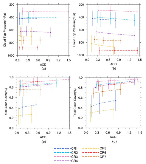 Due to the obvious relationships for AOD–CTP and AOD–TCC, we calculated the mean CTP and TCC for three equal sampling sized AOD subsets. The CTPs in the west (Figure 9a) and in the east (Figure 9b) decreased with the AOD for most cloud regimes. The TCC increased with AOD for all cloud regimes for both regions, especially in the east (Figure 9c,d). As Figure 9d shows, an increase in the TCC with AOD was evident in the east, especially for CR1 and CR5, for which the TCC was small (the mean TCC was 50% for CR1 and 29% for CR5). This obvious positive correlation between AOD and TCC has been seen in previous satellite retrievals [9]. Some studies have indicated that most of this strong correlation can be explained by aerosol humidification increasing the AOD in regions of high RH [64].