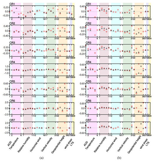 The multivariable linear regression between (a) CTP, (b) TCC and AOD and meteorological variables. In the order from top to bottom are results for seven cloud regimes (CR1–CR7). Black triangles represent results in eastern China while red circles represent results in western China. The missing data are variables that did not pass the significance test at the level of 0.05. The abscissa values are 1 for AOD, 2–6 for temperature, 7–11 for horizontal wind, 12–16 for relative humidity, 17–21 for vertical velocity, 22–26 for geopotential height at 200, 500, 700, 850, and 1000 hPa, respectively, 27 for wind shear, and 28 for LTS.