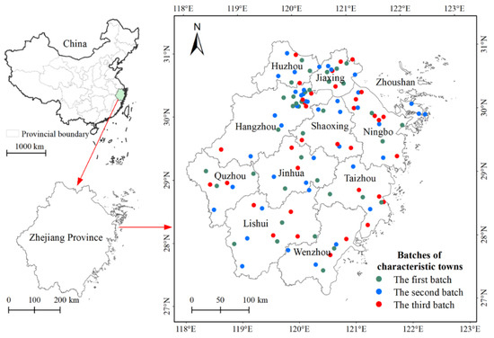 Zhejiang characteristic towns adhere to the notion of the “three-life integration”: production, life, and ecology and the “four in one” of industry, culture, tourism, and community functions. Furthermore, characteristic towns are suitable not only for high-quality economic development but for the development of high-quality urban and rural areas as well. In 2015, Zhejiang Province formally put forward the construction goal of characteristic towns. Both Figure 1 and Table 1 present the spatial distribution and basic information of the first three batches of characteristic towns.
