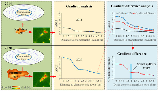 The gradient difference method uses the difference in the gradient distribution values of two different time nodes, to eliminate the linear trend of growth factors, which can accurately measure the influence range of spatial entities on the surrounding area. This method is also capable of better explaining the function of characteristic towns. Namely, it reduces the risk of over or undervaluing the impact of characteristic towns on the surrounding area.