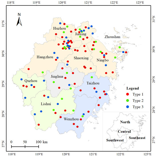 Our study analyzes the overall distribution in the four regions of Zhejiang Province. The results of this analysis are shown in Figure 5. According to Wang, D.X et al., 2020 [46], 11 cities in Zhejiang Province are divided into four regions according to their geographical location: north, central, southeast, and southwest. The north region includes Hangzhou, Jiaxing, Huzhou, Ningbo, Shaoxing, Zhoushan. The central region includes Jinhua, while south Zhejiang includes Wenzhou and Taizhou and southwest includes Quzhou and Lishui.