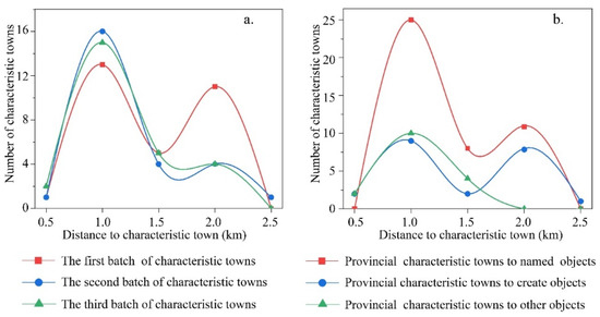 With respect to the construction time, there are significant differences in the amplitude of the first three batches of characteristic towns. Nevertheless, their change rules do not differ greatly. This observation also indicates that the construction degree of characteristic towns increases yearly. The characteristic town heterogeneity is enhanced, and the influence of characteristic towns on the surrounding area gradually becomes differentiated. Moreover, the trend of the 114 characteristic towns reveals that their spatial influence gradually decreases with an increase in the distance from the boundary. It begins to significantly decrease within a 1 km distance from the boundary (Figure 7a), relating to the dominant position of the construction land within the region. Furthermore, the agglomeration is significant within a 2 km distance from the towns’ boundary, reflecting the expansion and direction of their influence (Figure 7a). Among the first three batches of characteristic towns, only one town in the second group has a spatial influence range of 2.5 km. This may be connected to the industrial type of these specific towns.
