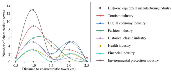 The industrial types of characteristic towns—digital economy industry, environ-mental protection industry, health industry, tourism industry, fashion industry, finance industry, high-end equipment manufacturing industry, and historical classic industry—have a decreasing influence on the surrounding area. Among the industry types of characteristic towns, high-end equipment manufacturing, tourism, and digital economy support the above trend with dominant numbers (Figure 8).