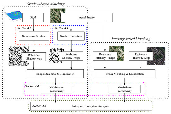 - Wang, H.; Cheng, Y.; Liu, N.; Kang, Z. A Method of Scene Matching Navigation in Urban Area Based on Shadow Matching. In Proceedings of the 2018 IEEE CSAA Guidance, Navigation and Control Conference (CGNCC), Xiamen, China, 10–12 August 2018; pp. 1–6. [Google Scholar] [CrossRef]