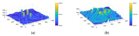 Urban DSM data. (a) DSM data with skyscrapers; (b) DSM data with ordinary buildings.