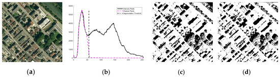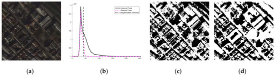 Under the strong illumination, objects such as shadow, vegetation, and man-made structures (buildings and roads) have distinguishable distributions in RGB channels. In this regard, the “first valley” method [48] uses a single channel or combined channel () to accurately determine the shadow area. Nagao et al.’s method determines the threshold by finding the position of the first valley closest to the value of 0 in the histogram of the combined channel and determines the pixels whose value is smaller than the threshold in the image as the shadow (Figure 6c). Unfortunately, it is not a parameter-adaptive method as the valley width parameter is set as a fixed value. Since the actual valley width is illumination-variant, Nagao et al.’s fixed-width valley method often fails. In most cases, at least one channel of an RGB image has a valley that can be detected as the threshold. Three independent channels are used to perform the detection with a dynamic search method so that the threshold adapts to various lighting environments.