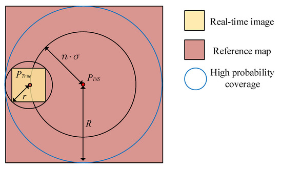 Then, the entire real-time image can be contained with high probability within the geographic coordinates of the circle (blue circle in Figure 8) with a radius :