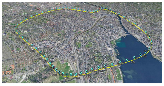 To demonstrate the application and performance of our proposed method, we designed a flight route in Zurich for simulated flight, as shown in Figure 12. The aerial image was taken on 24 July 2018, with the solar azimuth angle and solar elevation angle at 134.11° and 61.26°, respectively. The drone flew for 681 s and reached a total distance of 11.3 km at a horizontal speed of 60 Km per hour. The drone was outfitted with a gimbal camera that allowed it to take downward-looking photographs. The camera had a field of view of 77 degrees and captured images at a resolution of 720 × 720 pixels.