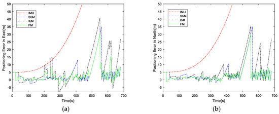 Performance of the four navigation modes. (a) Positioning error in east direction; (b) positioning error in north direction.