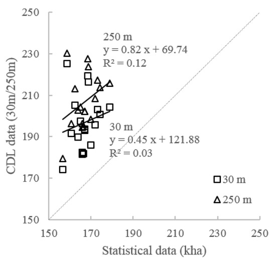 Historical sugarcane planting area maps from 2008 to 2016 were obtained from the Cropland Data Layer (CDL) data of the National Agricultural Statistics Service (NASS) (retrieved 19 September 2020, from https://www.nass.usda.gov/). The original spatial resolution of the CDL was 30 m, corresponding to the Landsat satellite. To match the spatial resolution of NDVI data, the original sugarcane maps from the CDL were resampled with 250 m spatial resolution. However, there were two main sources of uncertainties for the CDL data. On the one hand, CDL data indicated that the land use for a special crop mainly based on remote sensing, which is more or less uncertain. On the other hand, the CDL maps included the road in the sugarcane planting area and other non-sugarcane fields, particularly in the resampled maps with 250 m spatial resolution. Figure 2 shows the sugarcane planting area of the two states from the CDL maps with the original 30 m and the resampled 250 m spatial resolutions against the statistical data (described in Section 2.2.2 and shown on the x-axis) from 2008 to 2016. It was apparent that both the original and resampled CDL maps overestimated the sugarcane planting area. Additionally, in the sparse sugarcane planting area, the resampled CDL maps may have large errors. Thus, it was necessary to first extract the sugarcane planting area from the CDL maps based on the temporal pattern of NDVI data. Then the sugarcane yield prediction performance was analyzed under different planting densities.
