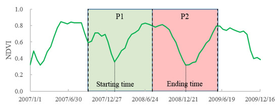 In Florida and Louisiana, the sugarcane harvest date is from October to May of the following year. In August, the sugarcane is planted and not harvested. This characteristic of sugarcane planting is helpful in judging the start and end times of sugarcane growth. Figure 4 shows the temporal evolution of NDVI data of a representative pixel from 2007 to 2009. The time in P1 is from 1 October 2007 to 31 July 2008, and the time in P2 is from 1 August 2008 to 31 May 2009. According to the characteristics of sugarcane planting, the starting and ending times must be located in P1 and P2, respectively. In this study, we determined that the time corresponding to the minimum NDVI in P1 was the starting time, and the time corresponding to the minimum NDVI in P2 was the ending time for the growth season in 2008. Using this method for each pixel, the length of the growth period, as well as the start and end times, was obtained.