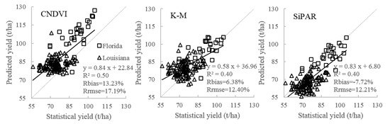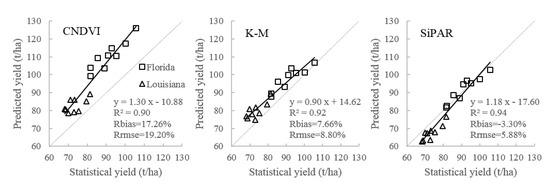 The CNDVI, K–M, and SiPAR models were applied to predict sugarcane yield in Florida and Louisiana. Figure 7 presents the prediction performance of the three models at the state level from 2008 to 2016. The three models were able to reflect the annual evolution of sugarcane yield on the consideration of slope and R2 close to 1.