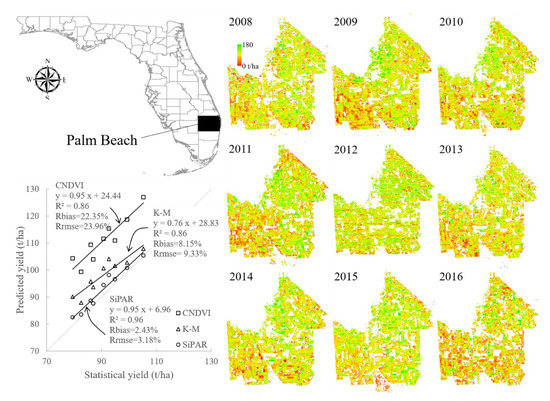 The SiPAR model has obtained high accuracy and strong robustness at field scale. It has the potential to be applied at the region scale by using remotely sensed data, and to the best of our knowledge, the SiPAR model has not yet been applied at the regional scale. This study applied the SiPAR model to predict the sugarcane yield in Florida and Louisiana and compare its performance with the CNDVI and K–M models.
