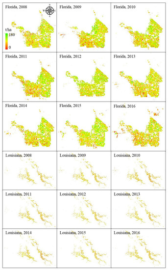 The predicted sugarcane yield maps using the SiPAR model in Florida and Louisiana from 2008 to 2016.