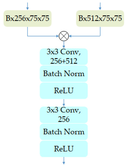 The OFFM effectively fuses feature information from both the upper and lower layers, as shown in Figure 3. The upper-layer network decoding result is established by the upper-layer network decoding module based on the 1/4 size image. The upper-layer result is further interpolated to 75 × 75 to facilitate combining the upper-layer result and the lower-layer result. The upper and lower layer results of the same size are fed into the OFFM module to obtain the fusion result. The fusion result has the classification marks after fast segmentation of the upper-layer network and maintains the details of the original size input image of the lower-layer, which plays a vital role in improving the final segmentation accuracy. After the concatenation, the fusion result consists of 256 + 512 channels which are convoluted by a 3 × 3 convolution core to generate the output feature map of 256 channels, then the feature is extracted and output by 3 × 3 convolution.