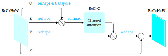 Based on application of the multi-layers network structure, the attention mechanism is introduced to improve inference accuracy further. An attention function can be described as mapping a Query (Q) and a set of Key (K)—Value (V) pairs to an output. For the self-attention of image application, the value of Q, K, and V are all from the input feature maps, as shown in Figure 4. The input shape of the module is B C H W. The CAM module only uses attention on the channel. Compared to the spatial attention mechanism, the calculation size of Q and V is changed from H W H W to use only C C, which not only maintains the correlation between channels but also reduces computational load. To calculate the attention between channels, we assign the input feature maps to K, Q, and V, respectively, and reshape them to B C HW. After transposing Q and multiplying it with K, the feature map shape of the output is B C C, and the attention map of each channel is obtained by softmax: